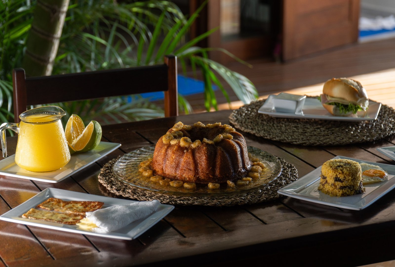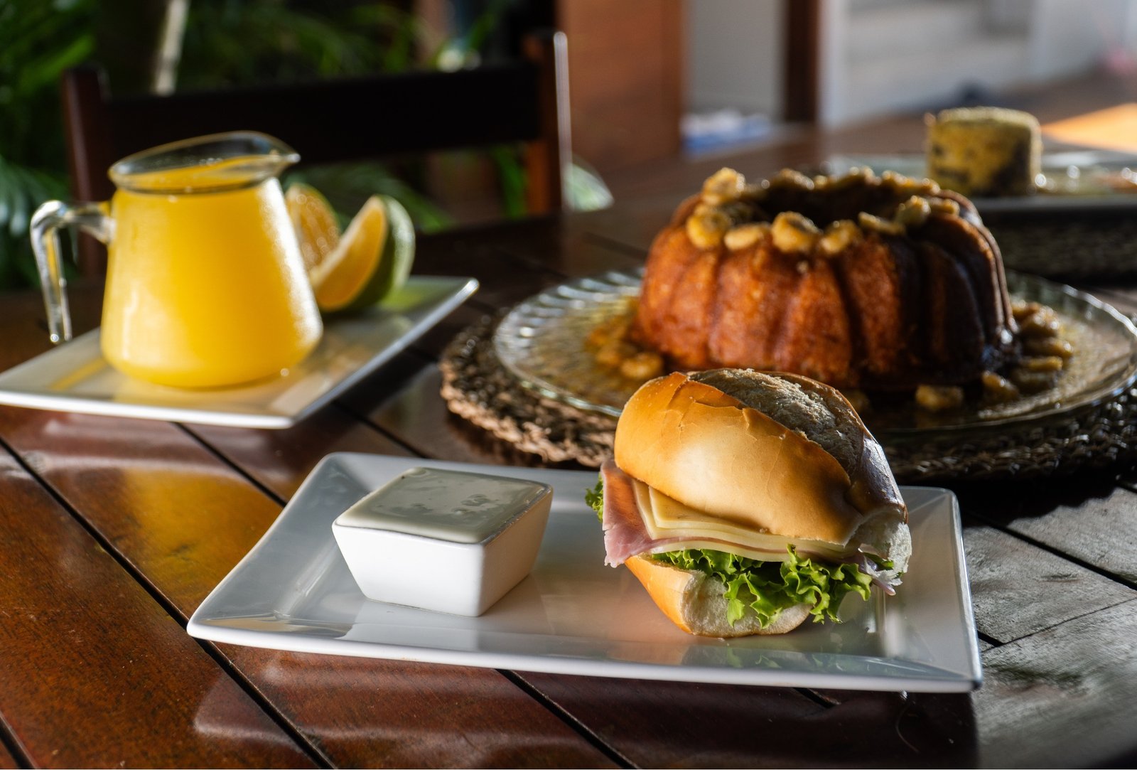 Frutas frescas da estação, pães caseiros, bolos feitos na hora, sucos naturais e queijos locais. Um café da manhã completo para você curtir o dia em Pipa