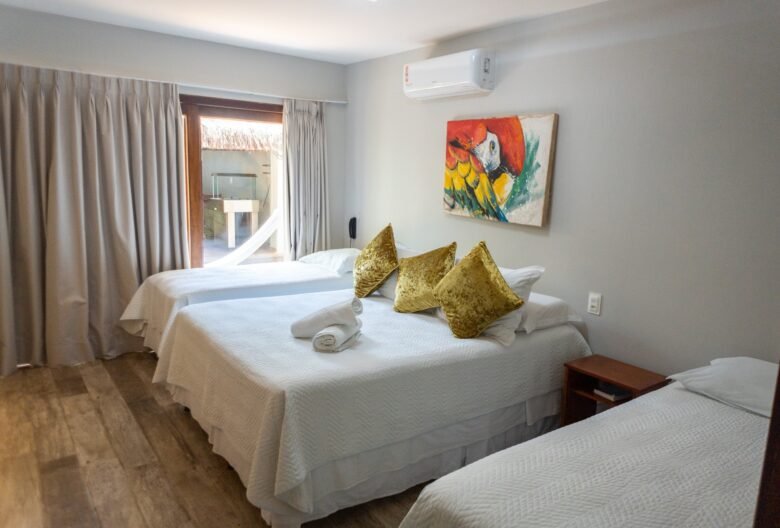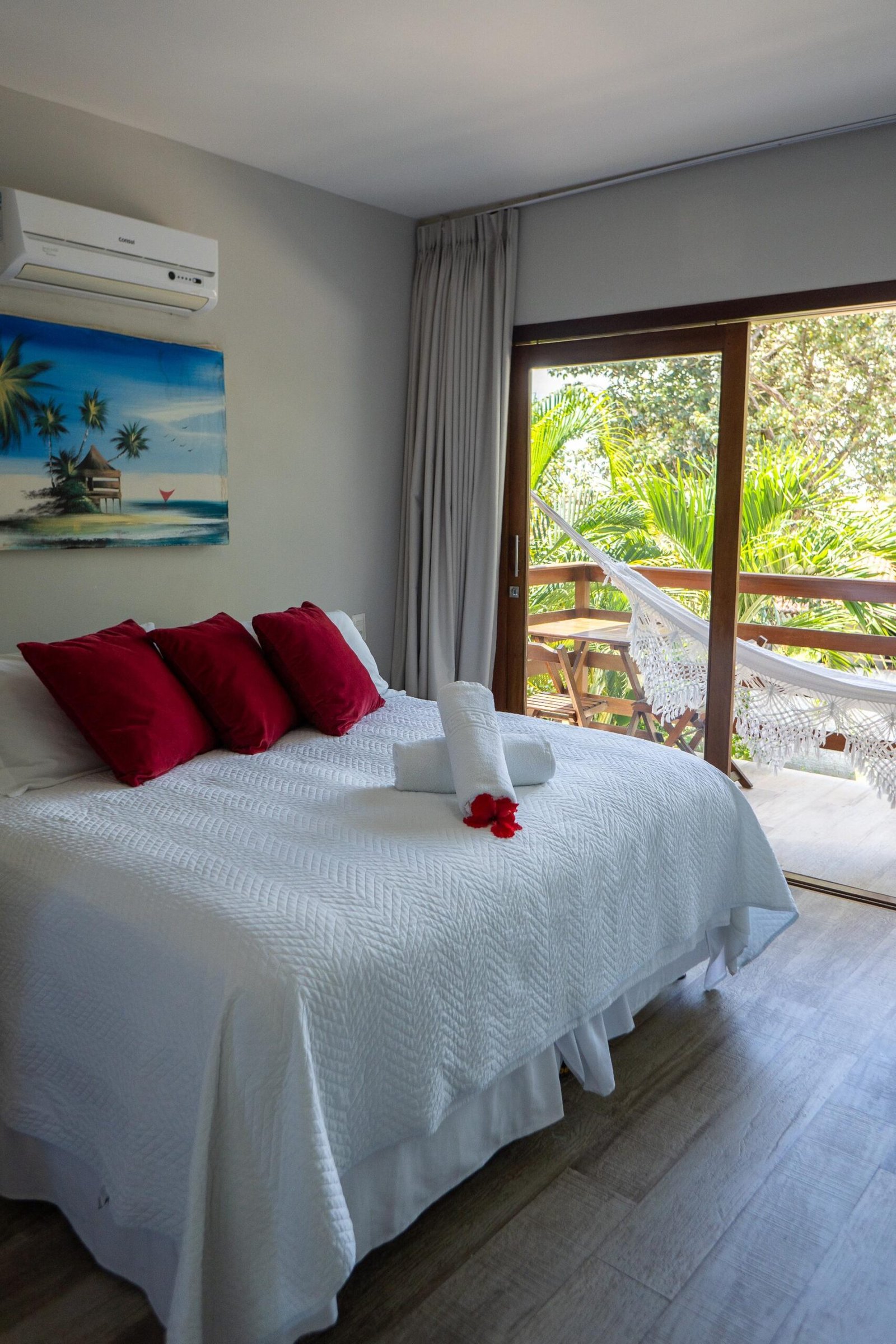 O Waikiki é o maior quarto da nossa pousada, perfeito para quem busca espaço e conforto. Conta com dois quartos — um com cama de casal e outro com cama de solteiro —, além de uma ampla varanda com vista privilegiada, mesa e duas redes para relaxar. O apartamento também oferece geladeira, micro-ondas, fogão e utensílios para sua praticidade.